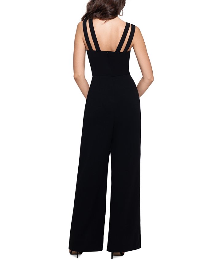 XSCAPE delivers a modern take on formal style with this wide-leg jumpsuit designed with double straps and a slit at the front hem for added movement with every step.| Approx. inseam; 32-1/2| Straight neckline; back zipper closure| Wide leg with slit at front hem| Double shoulder straps| IMPORTANT NOTE; This item arrives with a return tag attached and instructions for removal. Once the tag is removed from the dress