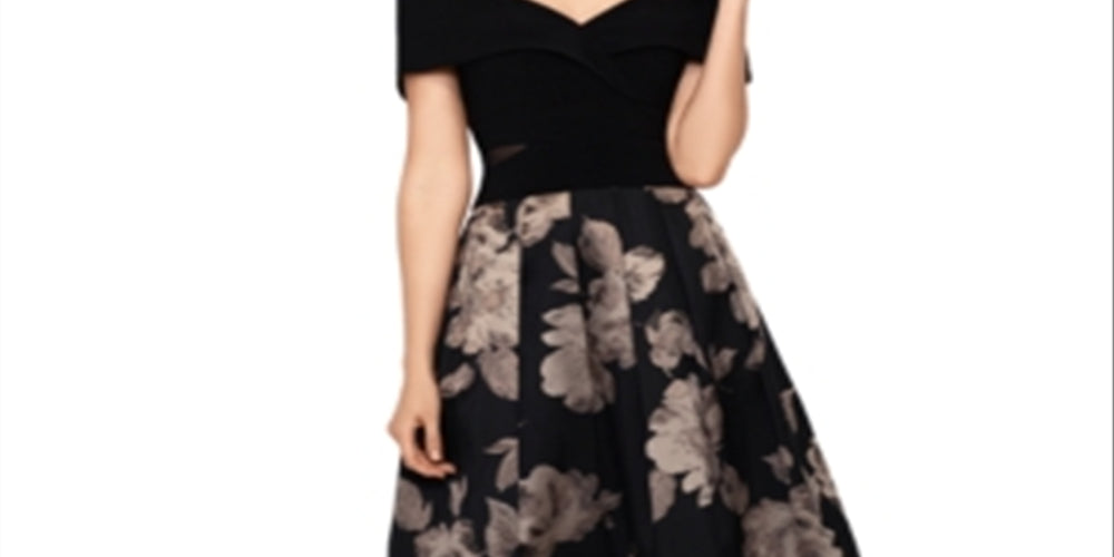 Seen on the fashion scene; XSCAPE's mixed-media look that's equal parts glam and charming.| Approx. 39 long from center back neck to hem. Length is based on size 4P and varies 1/8 between sizes| Designed to fit and flatter 5'4 and under frame| V-neck; Fit & flare silhouette| Hidden back zipper closure| Floral-print skirt; high-low hemline; hip pockets| IMPORTANT NOTE; This item arrives with a return tag attached and instructions for removal. Once the tag is removed from the dress