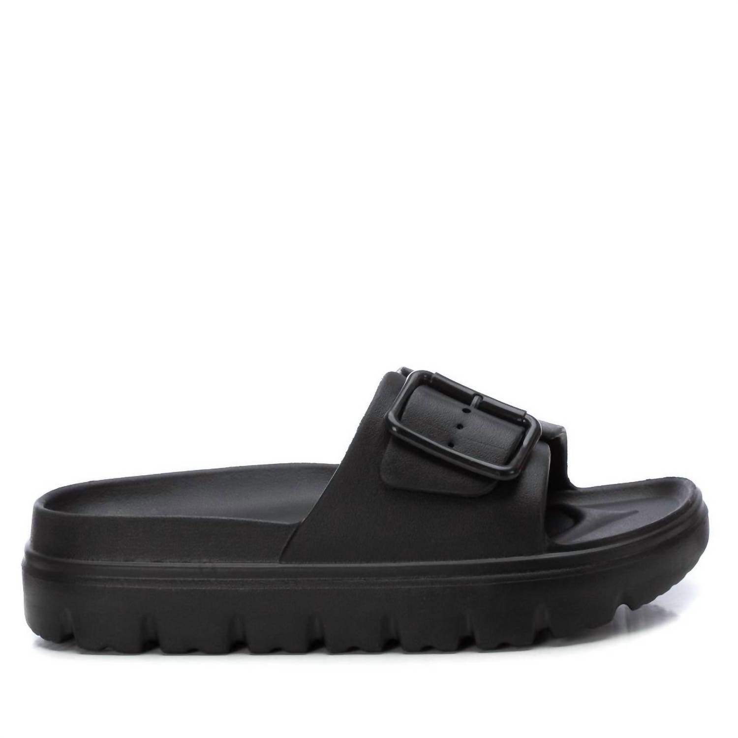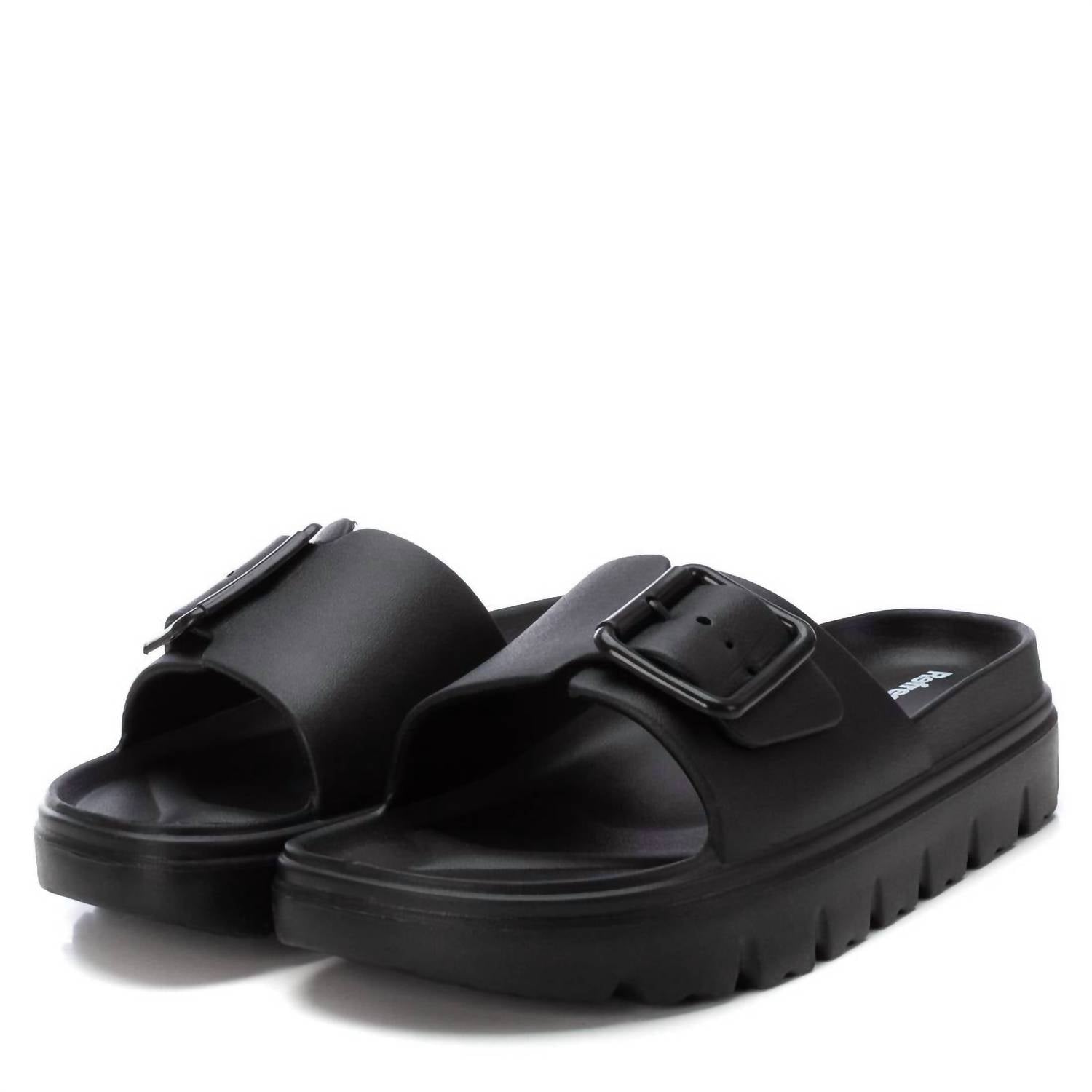 Introducing the Women's Sandals Refresh by Xti, a perfect blend of style and comfort for any occasion. These black sandals are designed with a round toe and feature a chic chunky heel, yet remain flat at 1" and under for ease of wear. Crafted for women, they seamlessly complement any outfit, whether you're at work or out with friends.
