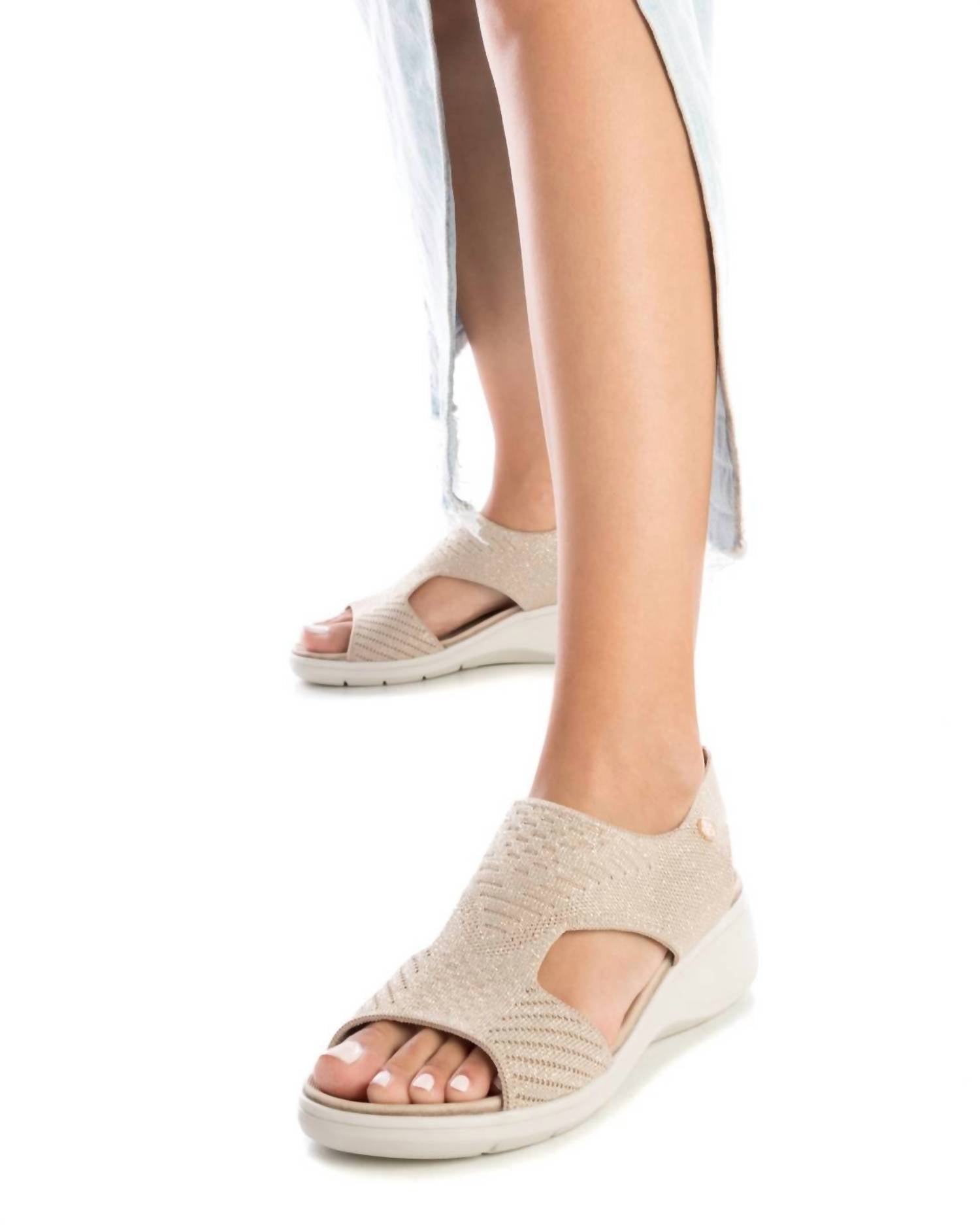 Classicly cute and all-day-wearable. We love this sandal. Upgrade your footwear collection with the Women's Wedge Sandals by Xti, designed for both style and comfort. Crafted from high quality, elastic beige textile, these sandals feature a padded comfort insole and a sturdy non-slip rubber sole, perfect for all-day wear. With a chic wedge heel approximately 0.5 inches high, they offer subtle elevation and support, making them ideal for any casual outing. Proudly vegan-certified by PETA, these trendy sandals are your guilt-free fashion choice.