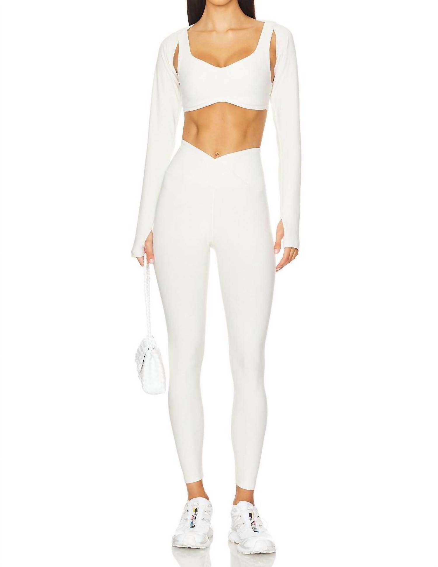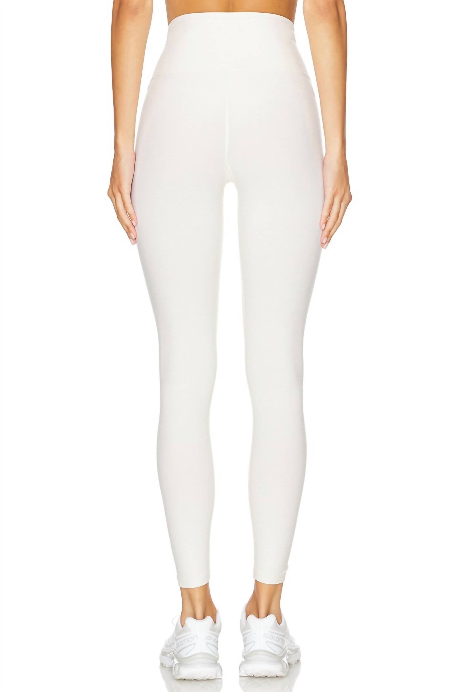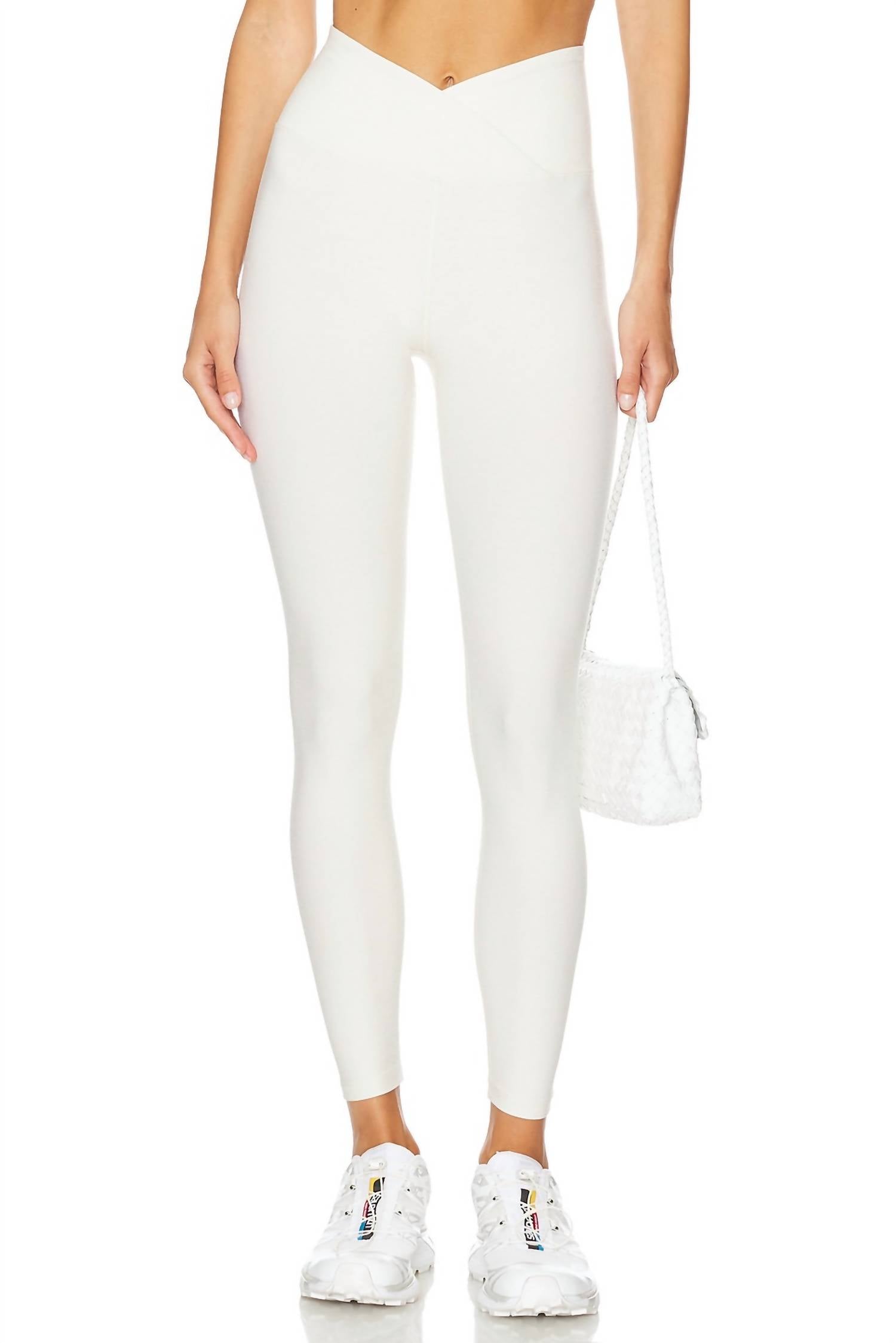 The legging you didn't know you needed and you won't want to take off. Step into style and comfort with the Stretch Veronica Legging by YEAR OF OURS, crafted from 87% polyester and 13% spandex. Made in the USA, these ivory leggings feature a high-rise waist with a twist detail and a skinny leg silhouette, perfect for activewear enthusiasts. The pull-on closure ensures ease of wear, while the solid pattern and sporty style offer versatility for various occasions. Care instructions recommend machine washing with cold water to maintain their pristine condition, with a convenient 24-inch inseam.