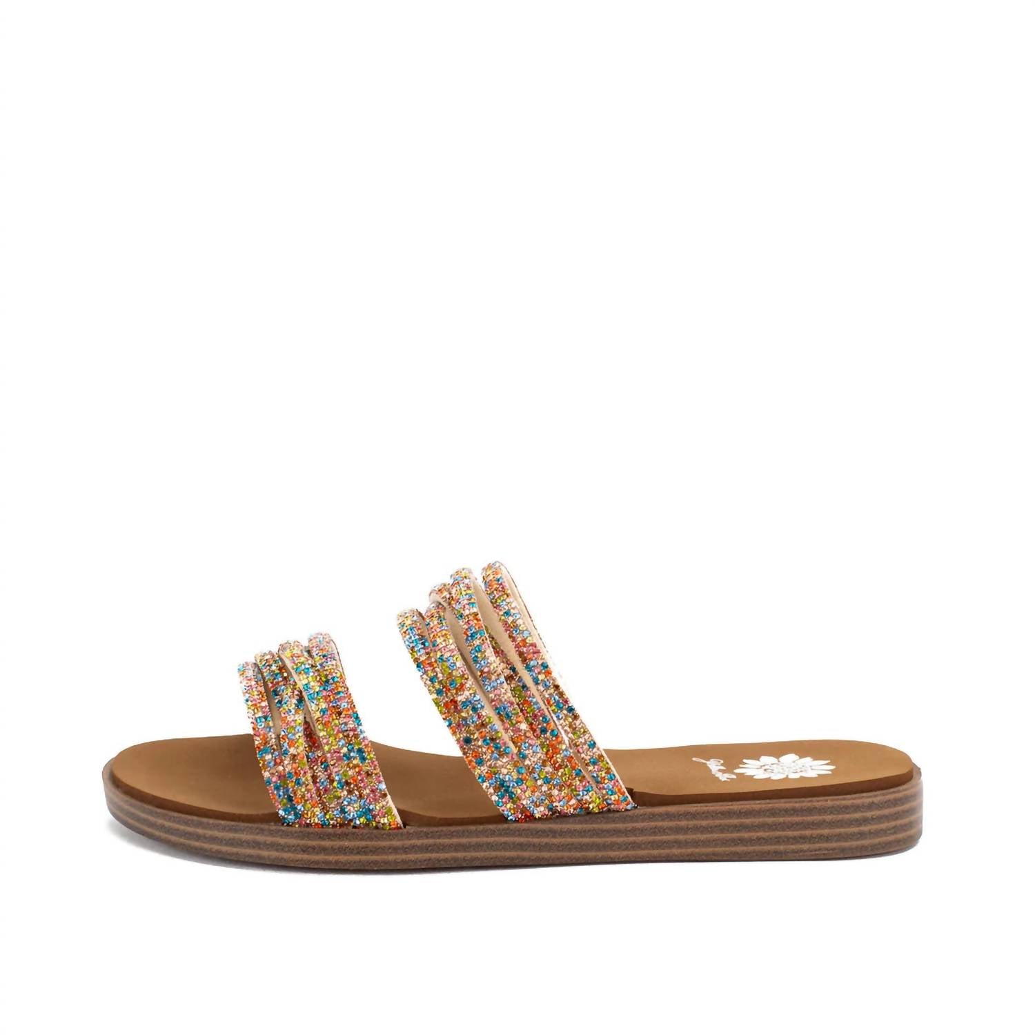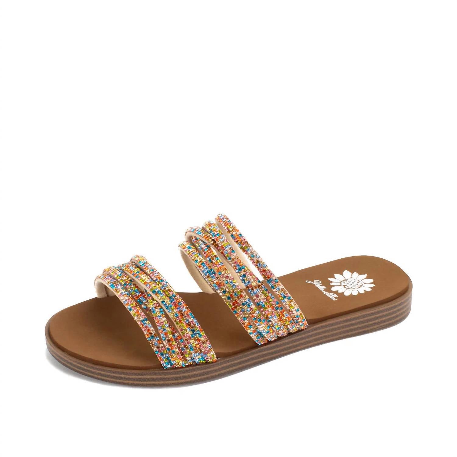This low-profile sandal features sparkling bracelet-like straps and a slender silhouette. It has a round toe, with a heel height of 0.75 inches and a 0.5-inch platform. Made from fabric, with a signature Yellow Box EVA insole and a rubber outsole.