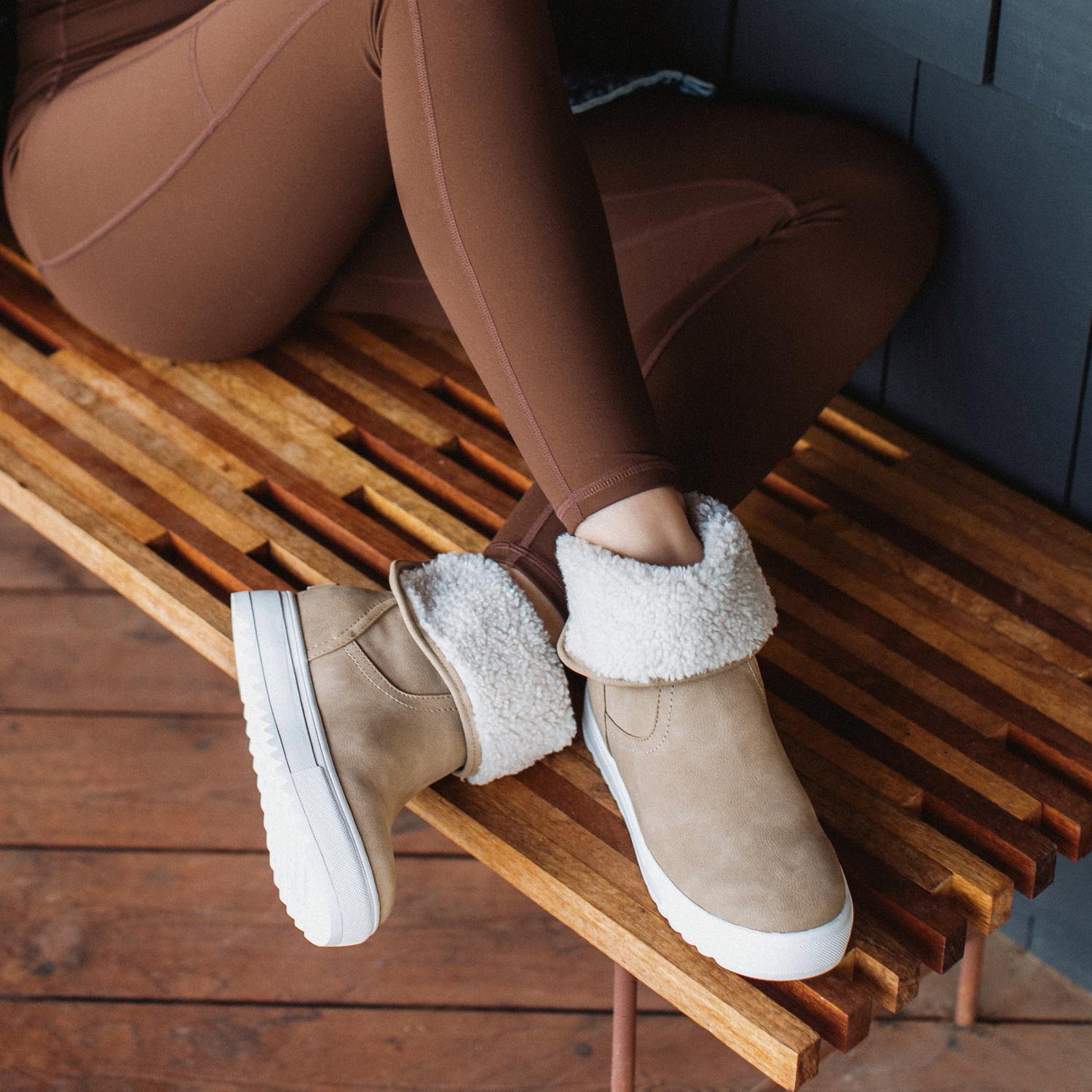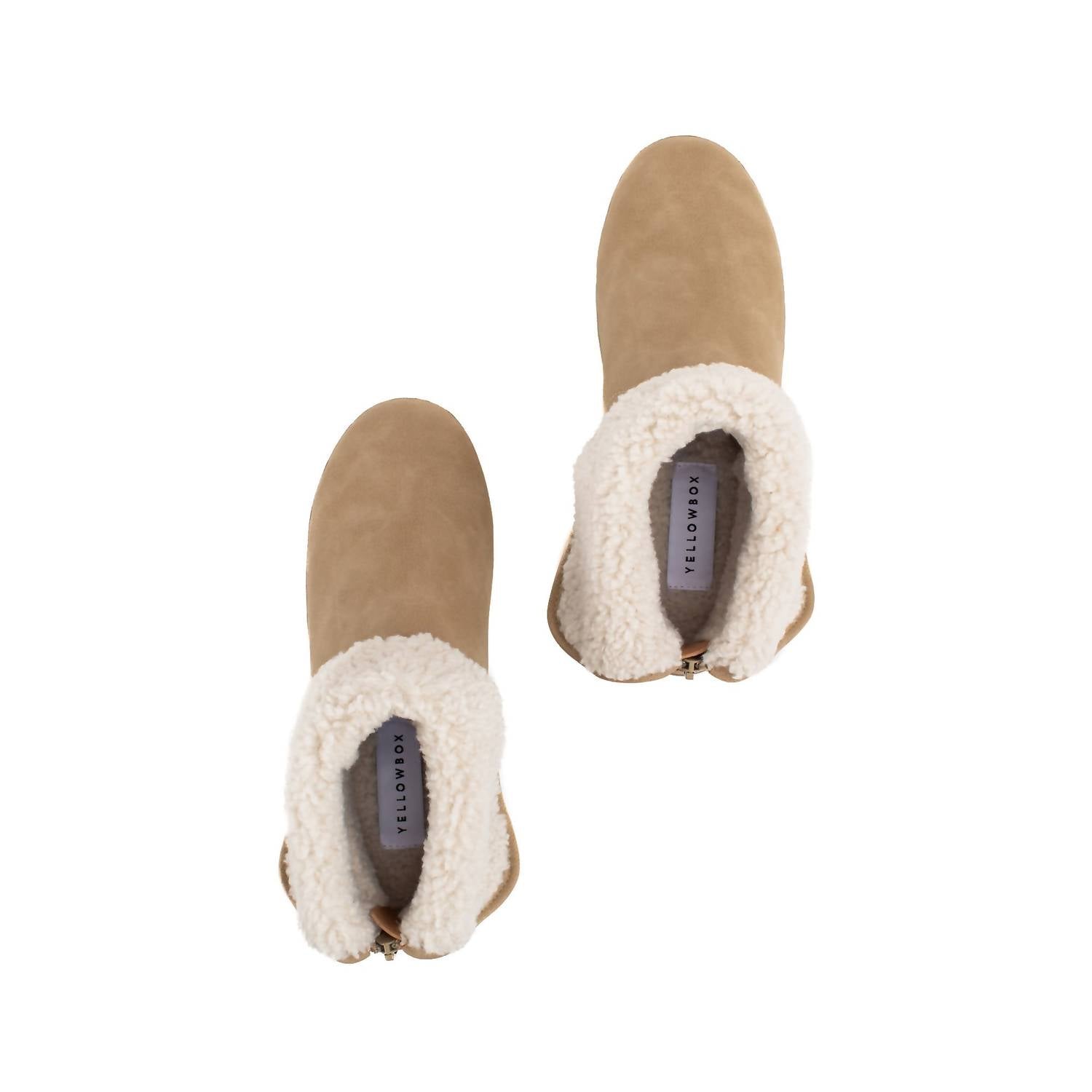 Say hello to the perfect, most versatile boot. The ankle height makes this style easily transition from day to night. Wear them with your favorite skinny jeans and tee for a more laid back look, or pair them with your favorite mini dress and jacket for a night out on the town. Discover the Women's Melisa Wedge Sneaker Boot by YELLOWBOX, perfect for transitioning into chilly days. This sand-colored boot features a stylish round toe and a fully lined faux shearling shaft, which can be worn either rolled up or folded down to reveal the plush faux-fur cuff. The back zipper closure allows for easy wear, while the hidden wedge heel offers a subtle 1.5-inch lift. Completed with a faux leather upper and a rubber outsole, these boots ensure comfort with a padded insole accented by mild arch support.