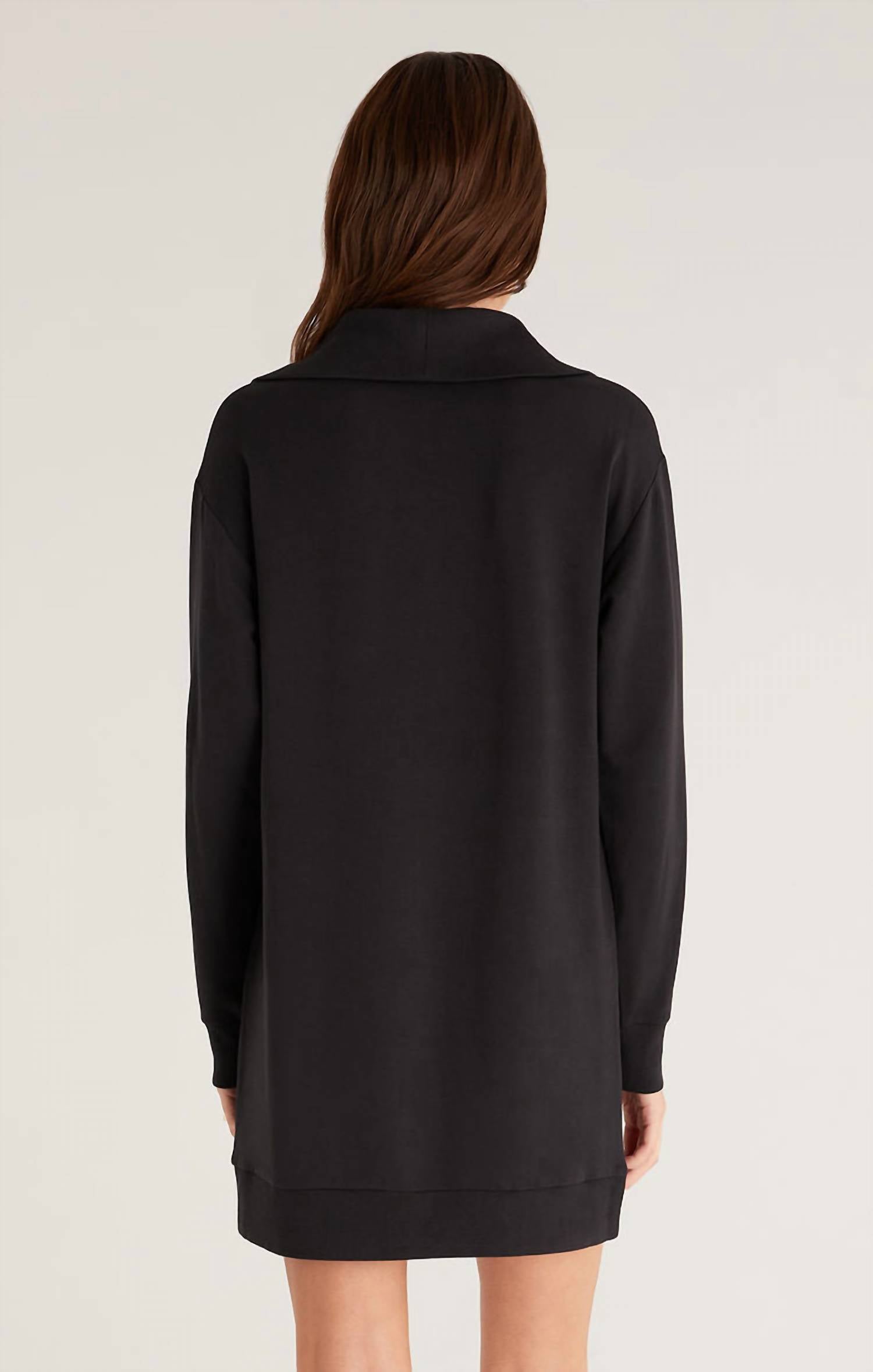 Introducing the Abigail Half Zip Mini Dress by Z Supply, a chic black mini designed for cozy comfort and style. This long-sleeved dress features a relaxed shift silhouette with a convenient zip closure and a smart collar neckline. Crafted from ultra-soft Modal Fleece with 97% Modal and 3% Spandex, it's perfect for pairing with leggings or tall boots. Model is wearing a size S (5'9" height, 31" bust, 24" waist, 34" hips).