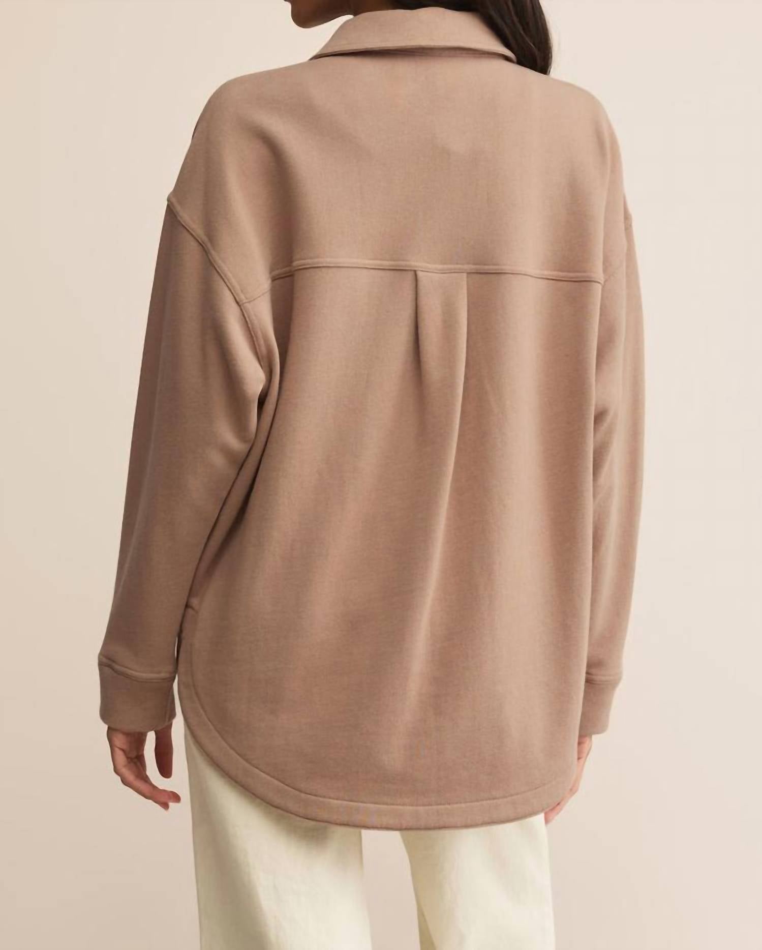 Cute, casual, and comfortable. This jacket is a must have. Introducing the All Day Knit Denim Jacket by Z Supply in a rich Iced Coffee hue, crafted for comfort and style. With its long sleeves and full length, this jacket features a 100% cotton composition, promising breathability and softness. It showcases a button closure, collared neckline, and practical chest pockets, effortlessly combining style and functionality. Care is simple with machine wash and line dry instructions, making it a staple for any wardrobe.