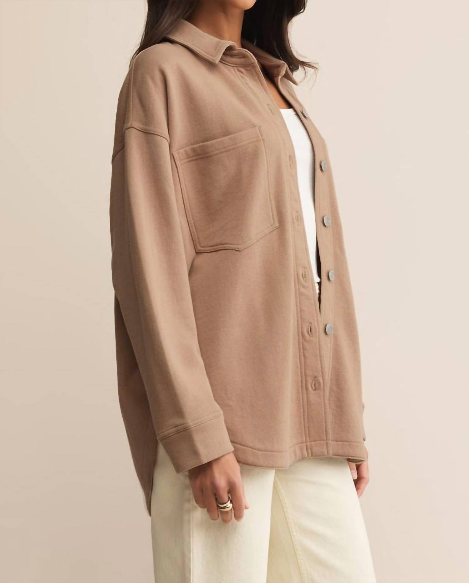 Introducing the All Day Knit Denim Jacket by Z Supply in a rich Iced Coffee hue, crafted for comfort and style. With its long sleeves and full length, this jacket features a 100% cotton composition, promising breathability and softness. It showcases a button closure, collared neckline, and practical chest pockets, effortlessly combining style and functionality. Care is simple with machine wash and line dry instructions, making it a staple for any wardrobe.