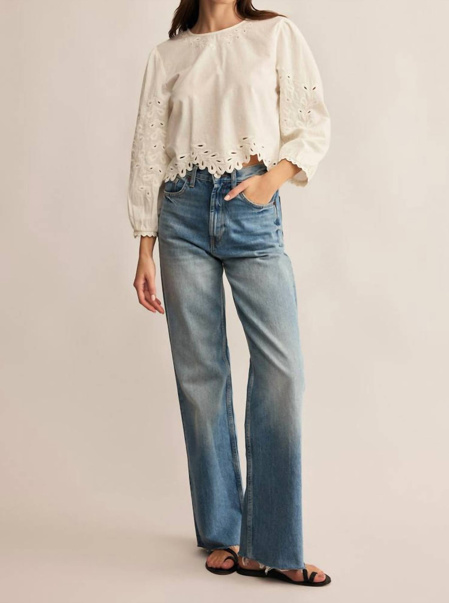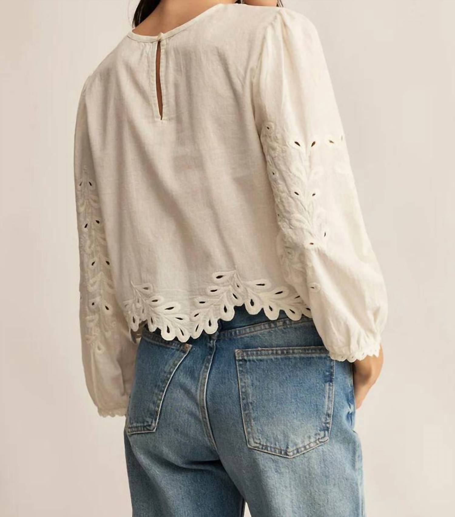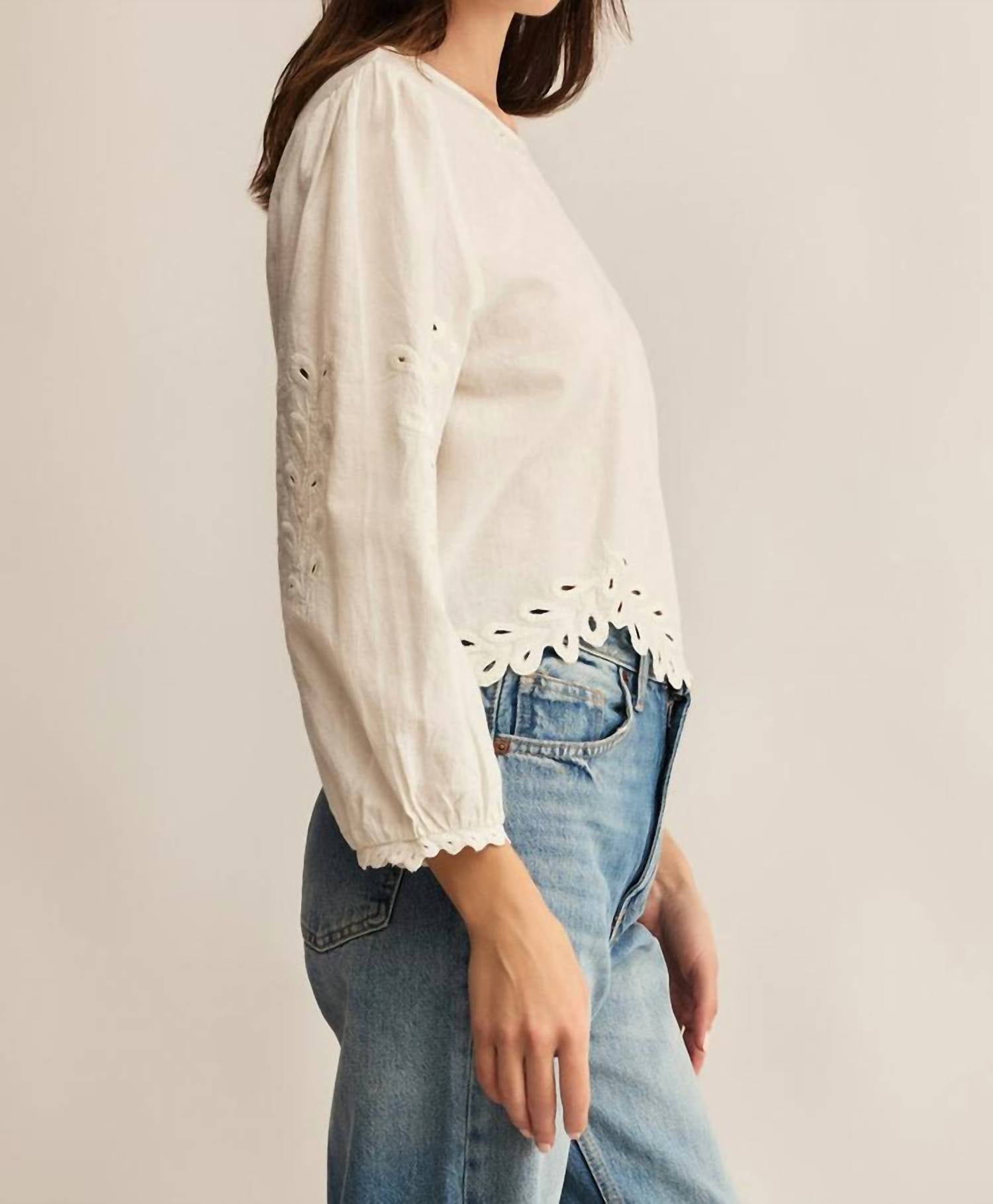 Pair this with your favorite jeans and slides for your next girls night out. Elevate your warm-weather wardrobe with the Ambriose Top by Z Supply in white, offering a textured, minimalist design. This women's blouse features long sleeves and a cropped length, with a comfortable crewneck. Crafted from a blend of 77% cotton and 23% linen, it ensures breathable comfort for summer days. Closure: Button closure. Care: Hand wash and line dry. Measurements for size XS: 17" garment length from shoulder, 35" bust.