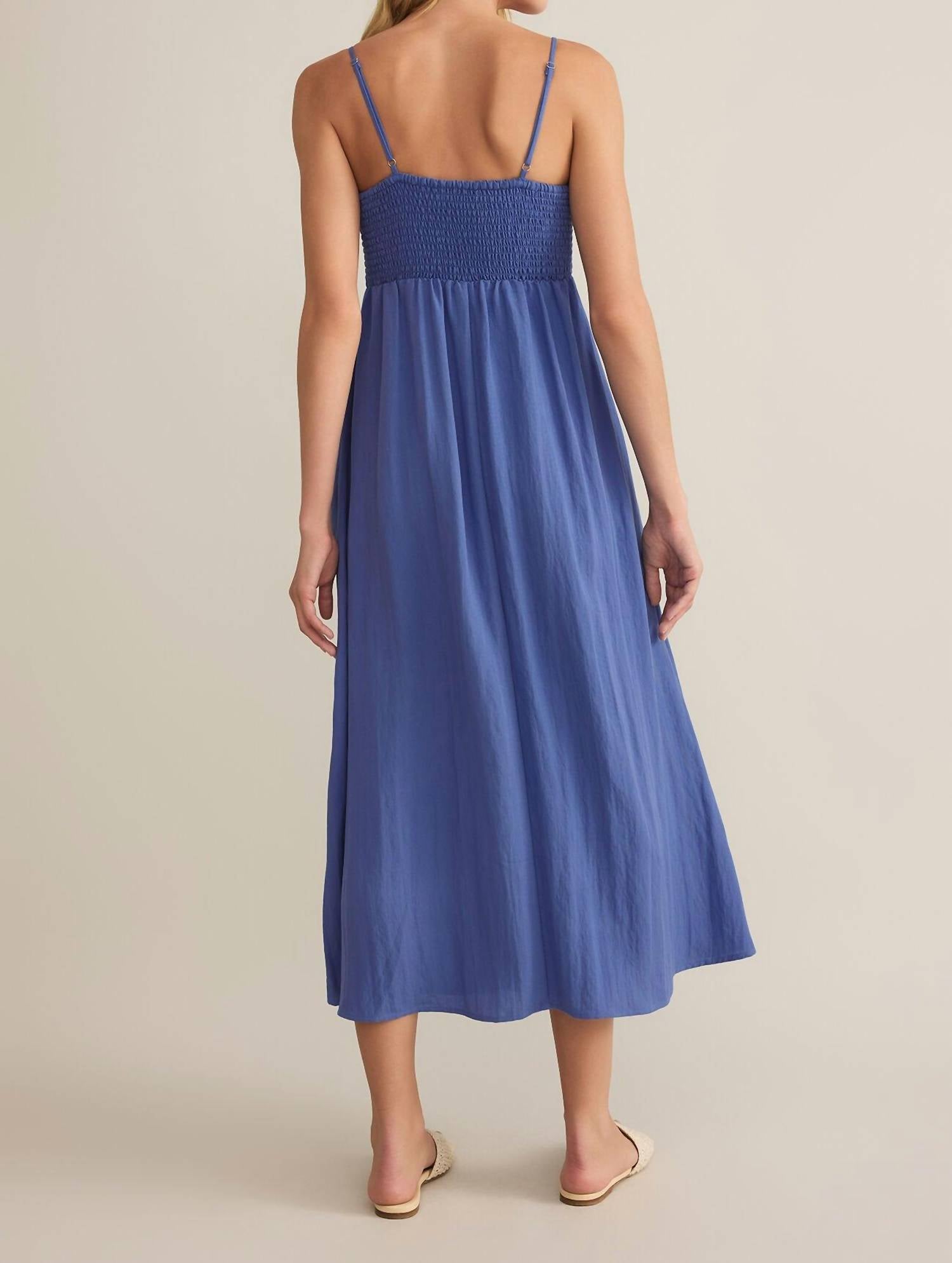 Embrace the effortless style of the Beachside Midi Dress by Z Supply, perfect for any summer occasion. This A-line dress in solid blue features spaghetti straps and a straight neckline, with a smocked bodice for added flair. Made from breezy rayon, the dress has a pull-on closure and convenient pockets, adding to its relaxed, boho-chic appeal. Care is simple with machine wash instructions and lay flat to dry for lasting quality.