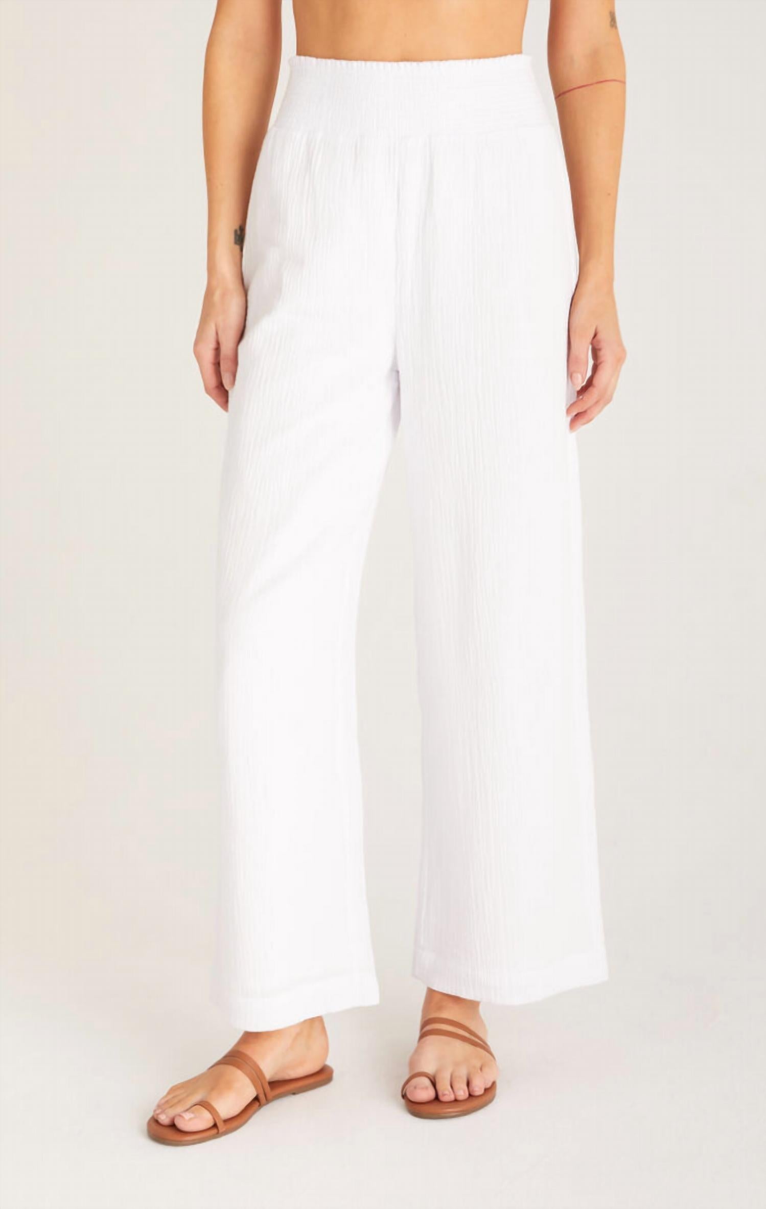 Pull-on comfort. High waisted. Straight leg. Wide elastic waistband. 100% Cotton.
