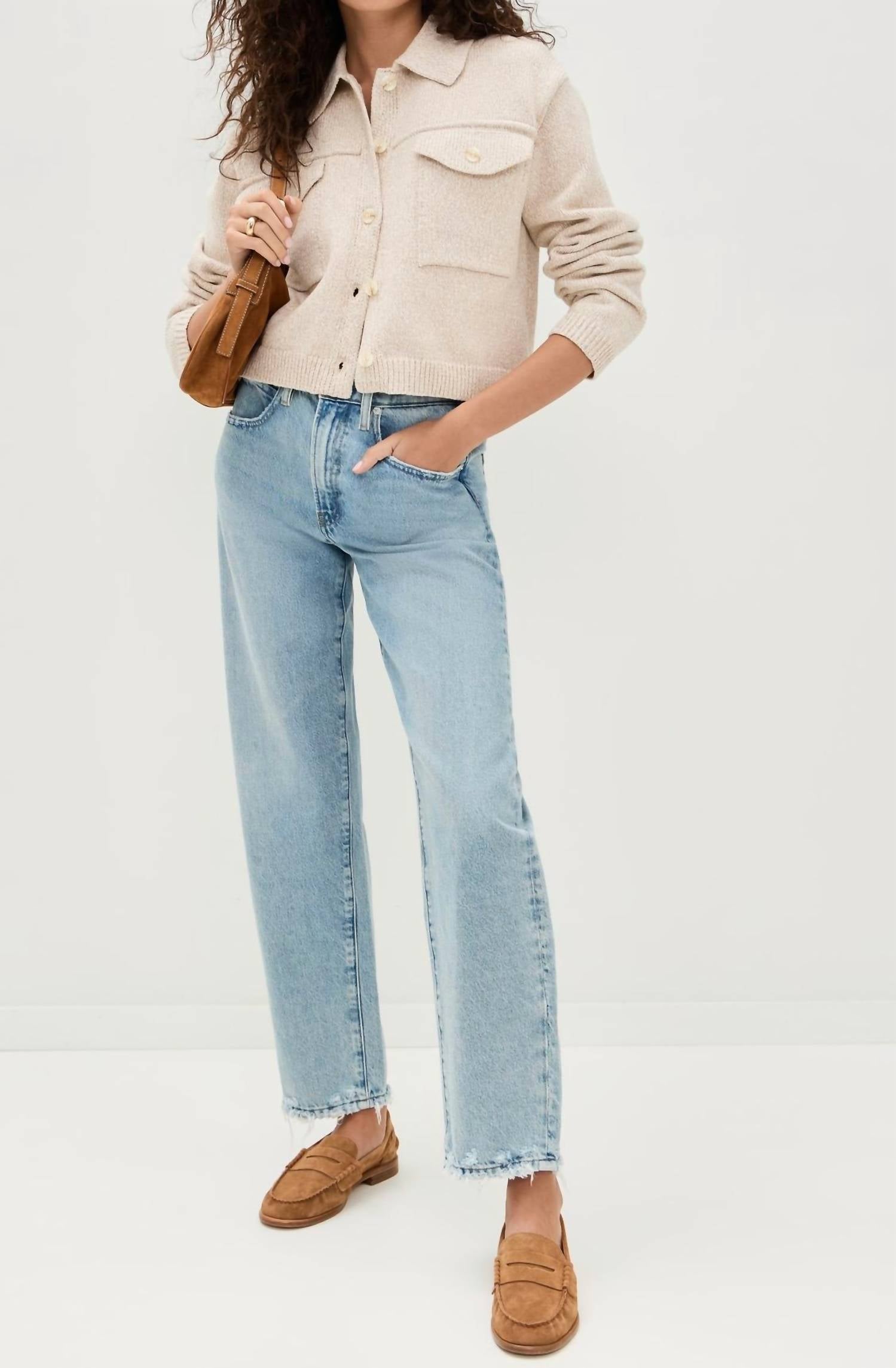 It features long sleeves with dropped shoulders and a collared neck, giving it a relaxed yet sophisticated vibe. Made from a mid-weight knit composed of 59% cotton and 41% acrylic, this jacket is 19.25" in length and includes practical flap breast pockets. Closure is secured with a button placket, and it is imported from China. Care for this stylish piece with a simple hand wash.