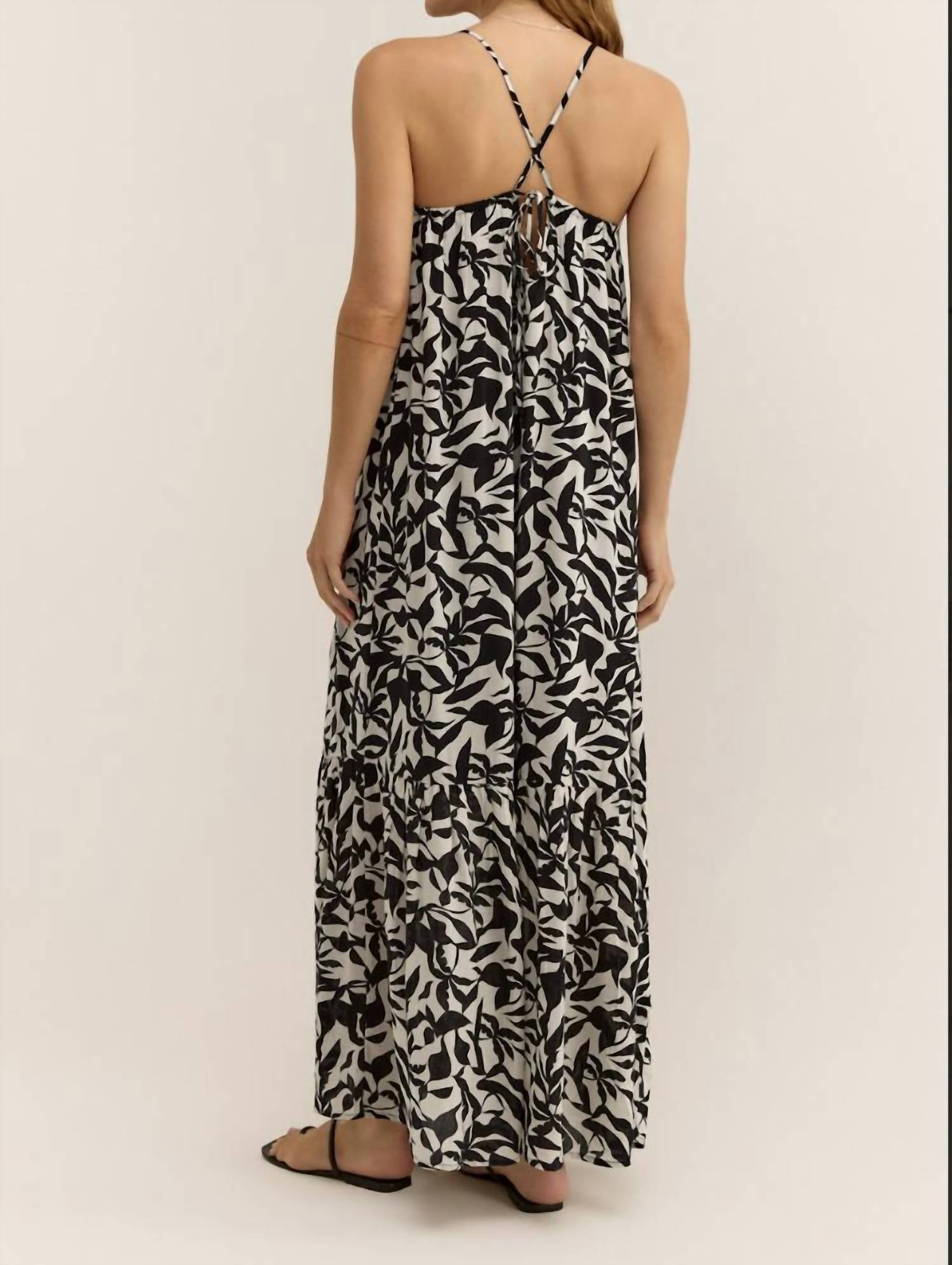 A maxi dress that is just as cute as it is comfortable. Embrace the effortless elegance of the Cocktail Hour Leaf Maxi Dress by Z Supply, a must-have for this spring. Featuring spaghetti straps with a criss-cross design, this dress offers a flattering ruched neckline and playful ruffle details in a flowy A-line silhouette. Crafted in 100% delicate flat viscose, it comes with a scooped low back complete with a charming tie closure. Perfect for vacation or beach outings, care for this black patterned dress by hand washing and line drying.