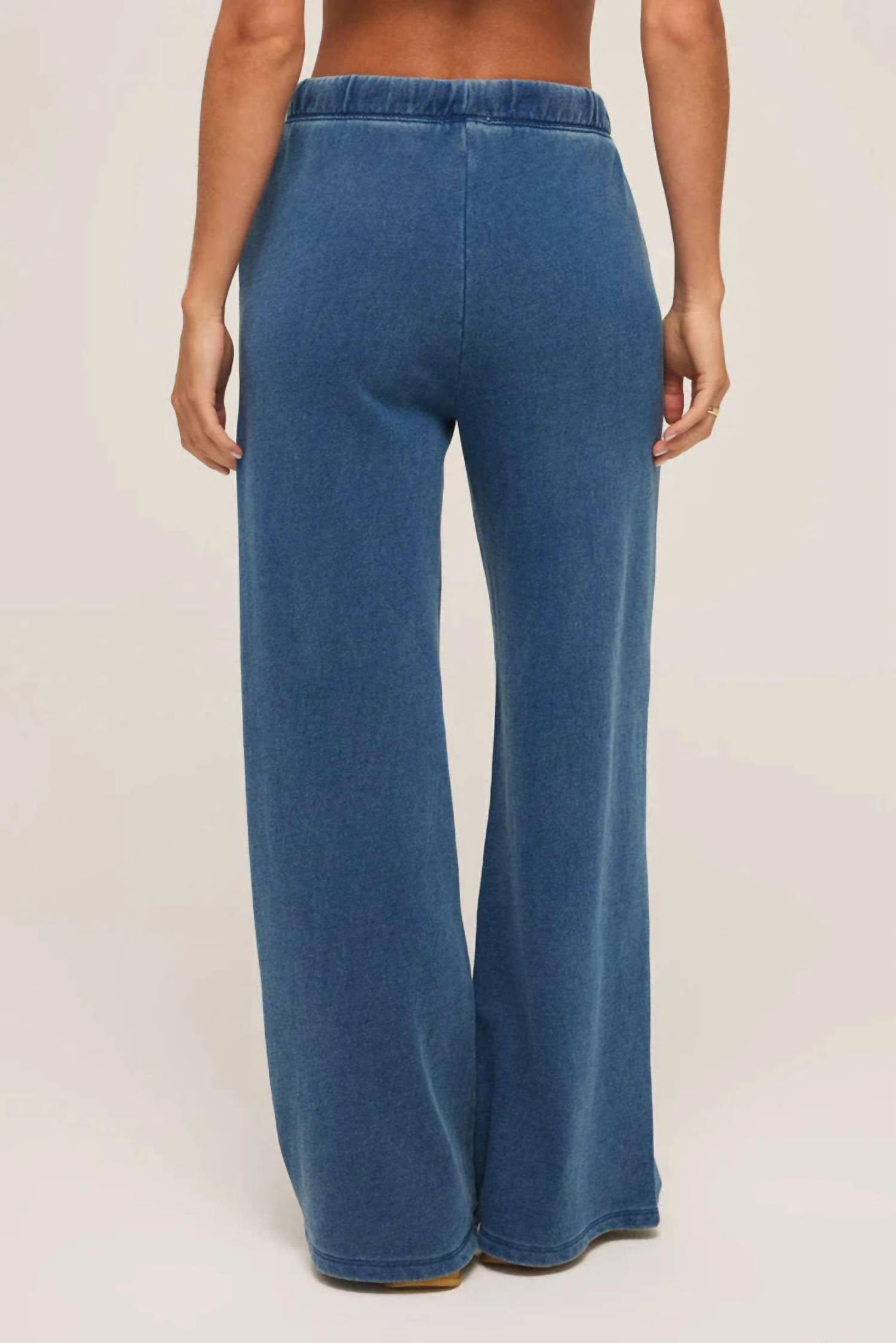 Introducing the Denim Wide Leg Knit Pants by Z Supply, a stylish blend of streetwear and comfort that's perfectly fitting for summer travels. These women's pants feature a mid-rise, regular fit with an elastic waistband and drawstring for customization, complete with functional trouser pockets. Crafted from a lightweight knit consisting of 85% cotton and 15% polyester, these straight-leg, medium-wash denim pants are ideal for any occasion. Closure: Pull-on. Care: Machine wash and tumble dry. Linda is wearing a size large.