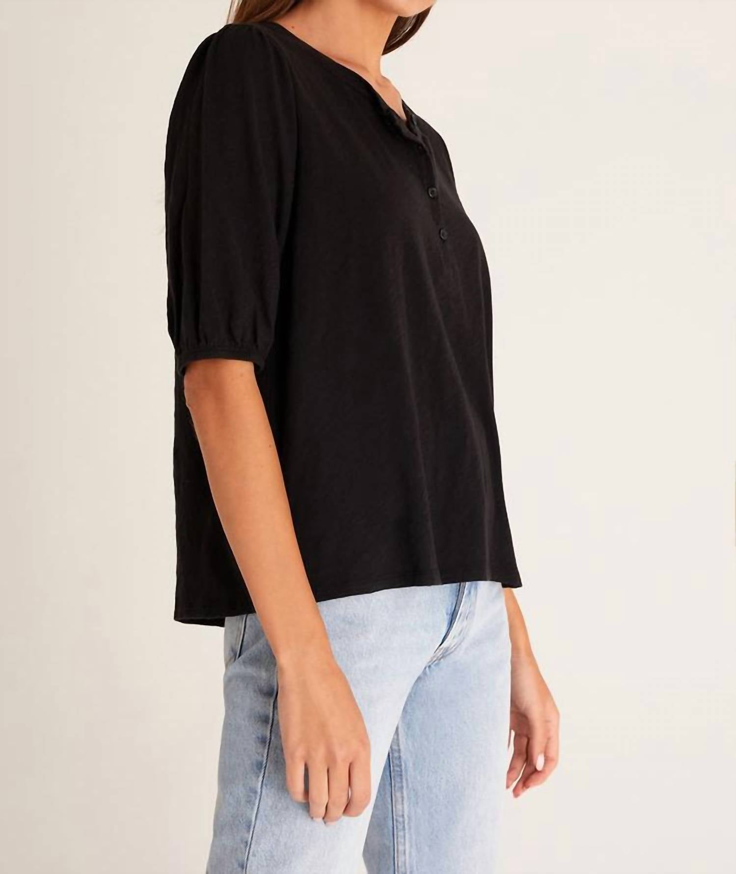 A long sleeve top you can wear with denim, skirts, well... just about anything!Features a button-front. Open neckline. Pleated detail at the back. Feminine puff sleeves. 100% Cotton