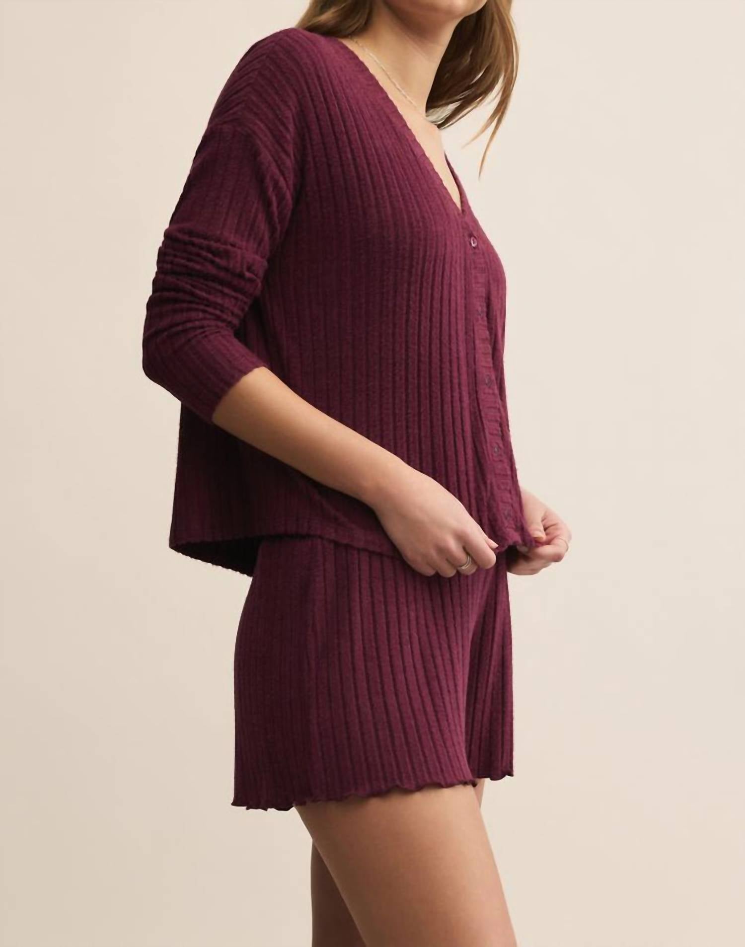 Introducing the Mara Rib Cardigan by Z Supply, a minimalist essential in elegant merlot for your vacation wardrobe. This cardigan features a long sleeve design and a flattering V-neckline, perfect for layering or wearing solo. Made from a silky rib knit of 97% Polyester and 3% Spandex, it offers a regular fit with just the right amount of stretch. Closure comes via stylish button front, and care is simple with machine wash cold and lay flat to dry instructions.
