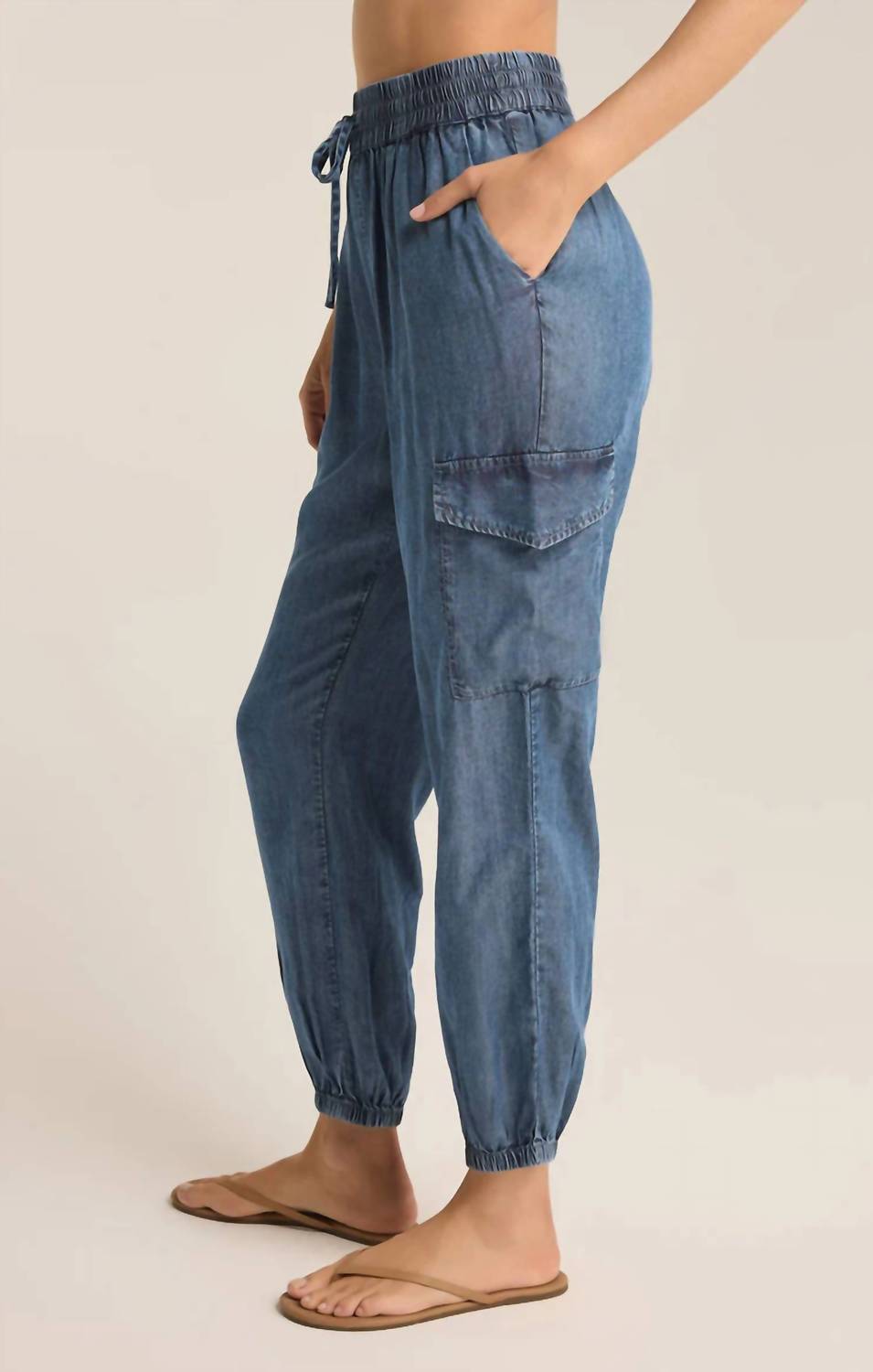 Meet the Rory Cargo Jogger by Z Supply, a must-have for your spring wardrobe in stylish washed chambray. This jogger offers a high-rise, relaxed fit with a tapered leg, featuring an elastic drawstring waistband and tapered elastic cuffs for an ideal fit. Crafted from 100% Lyocell, it also includes functional cargo pockets. Care instructions: hand wash cold, turn inside out, and hang to dry.