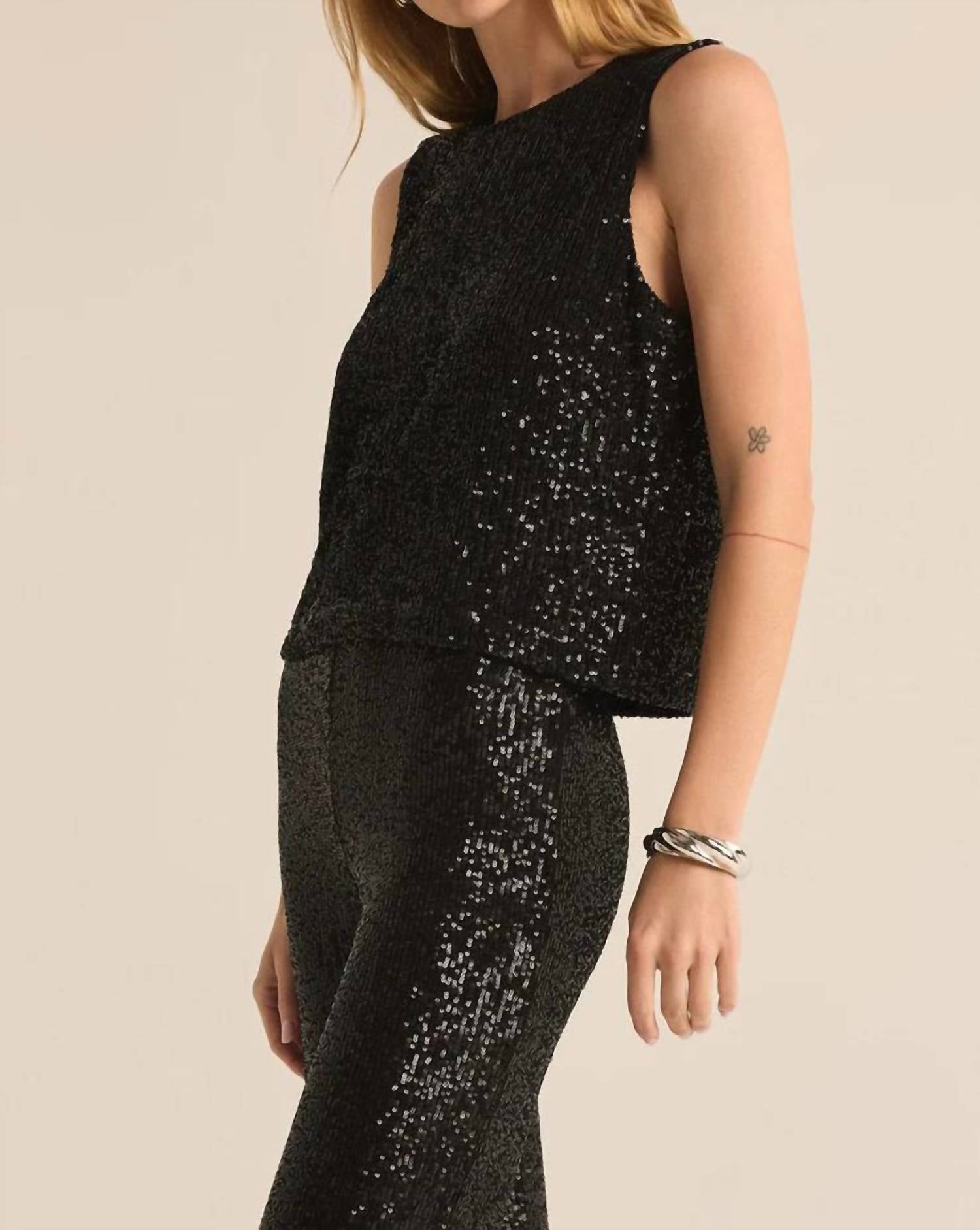 Discover the Sloane Sequin Tank by Z Supply, an essential addition to your wardrobe with a chic update in a sparkly black sequin design. This sleeveless, crewneck top offers lightweight comfort with a stretch sequin composition of 92% Polyester and 8% Spandex, making it perfect for any occasion. Featuring a pull-on closure and a lined bodice, this tank delivers a sleek silhouette. Care for this dazzling piece with a delicate wash and lay flat to dry, ensuring it stays a staple for seasons to come. Garment length: 20", bust: 35.5" in size S.