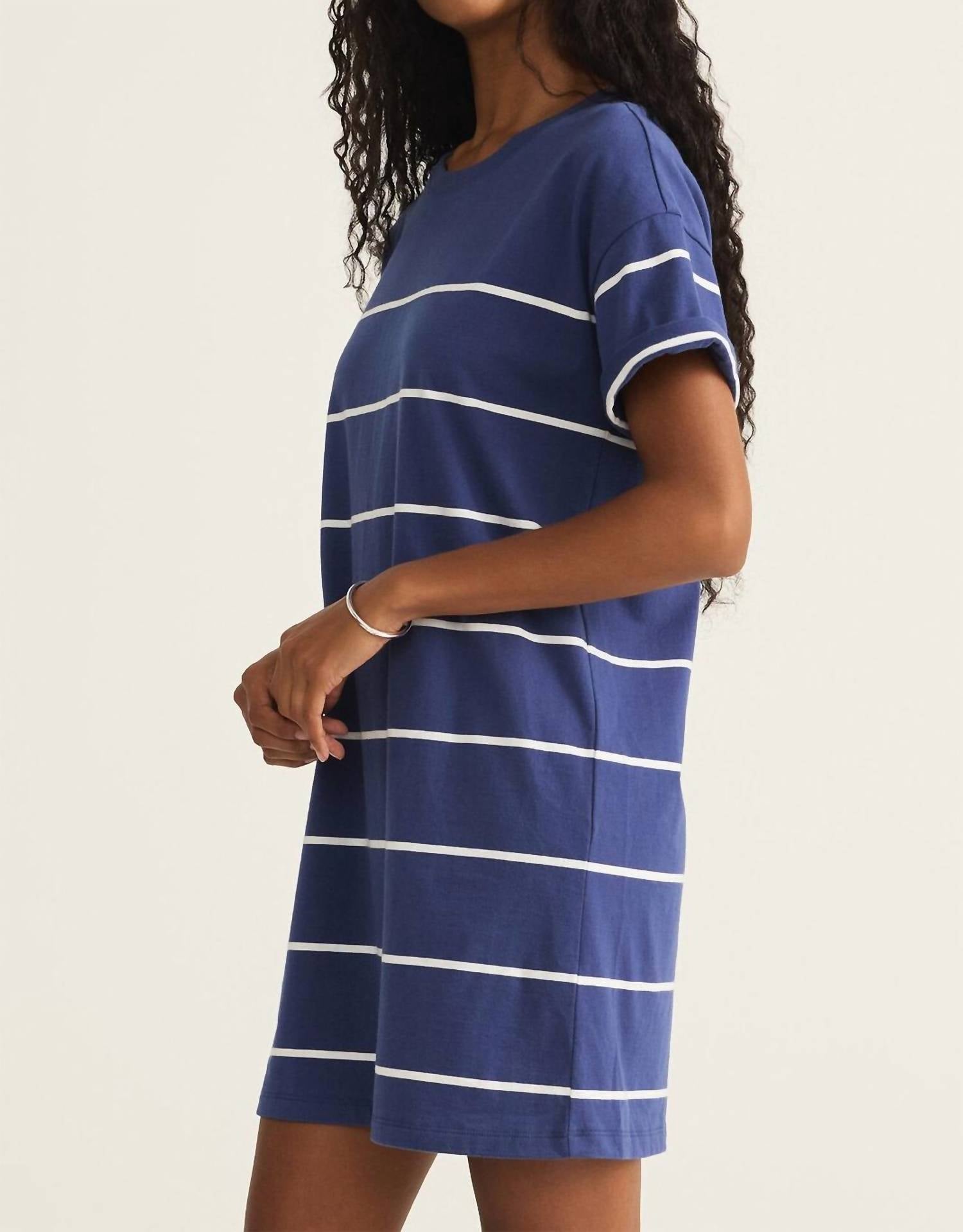 A short and breezy dress for those warmer days. Presenting the Sway Stripe Mini Dress by Z Supply in Yacht Blue, a must-have for those sunny summer days. This mini dress is crafted from 100% cotton jersey, featuring a relaxed shift silhouette with a crew neck and short sleeves for effortless elegance. Its pull-on design ensures easy wear, while the yarn-dyed stripes deliver a nautical flair. Dress length varies from 32 3/4" to 35" and bust from 36 3/4" to 40 3/4" across sizes XS to L, making it a perfect fit for beach parties or casual outings.