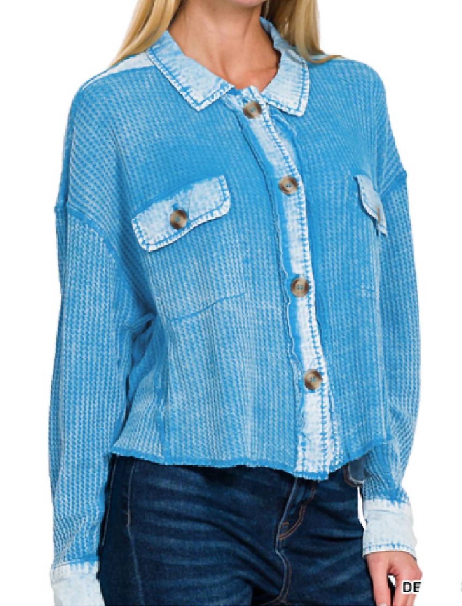 Tailored to perfection, this blazer will be your go-to jacket for years to come. This Acid Wash Waffle Knit Crop Shacket - Deep Sky is a fan favorite! The blue sky-inspired hue gives off major spring vibes, and it's lightweight and adorably versatile - great for chilly days and nights, and a must-have for cold restaurants, offices, flights, cruises, and movie theaters. (Seriously, it's a lifesaver!)And it's got pockets - always a good thing!Fit is true to size - maybe a little on the oversize spectrumTotal body length - 20" measured from S/M size100% CottonMachine Wash