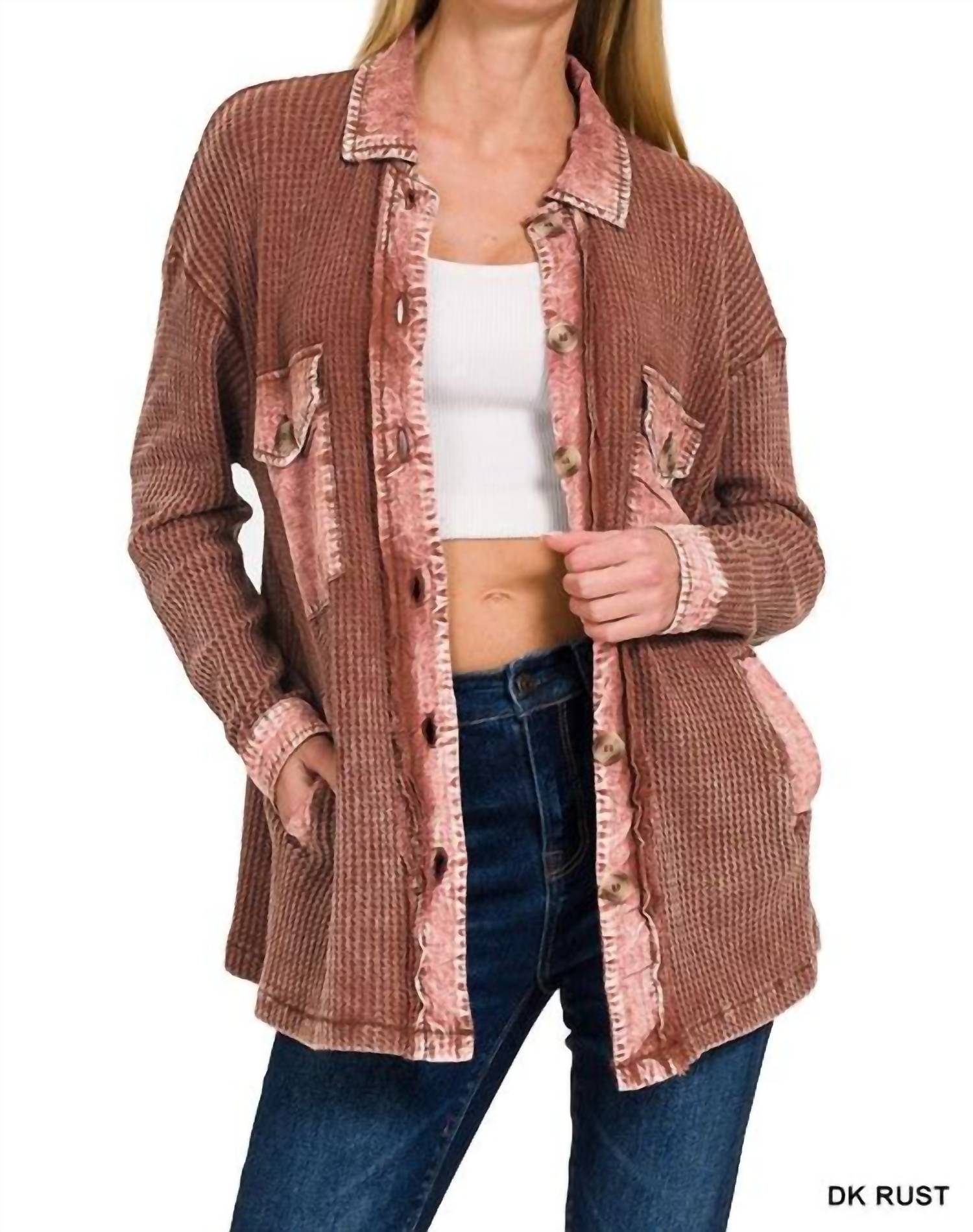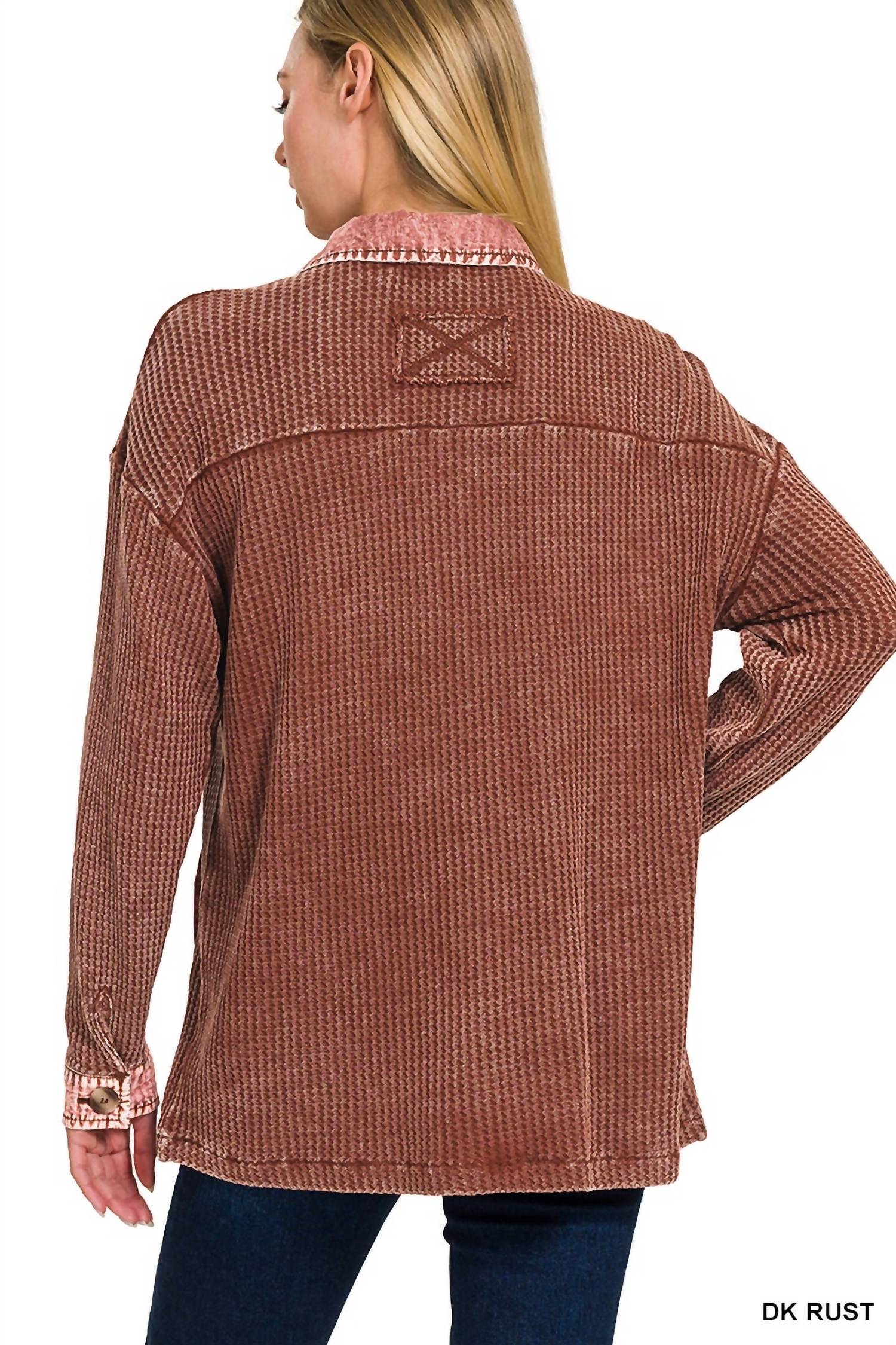The coolest, most versatile utility jacket. Match it with your favorite pair of denim or throw it over any day dress. Elevate your fall wardrobe with the Tori Waffle Knit Acid Wash Shacket by ZENANA, a perfect blend of boho chic style and comfort in dark rust. This utility jacket features long sleeves, made of 100% cotton that is sure to add warmth to your seasonal outfits. Designed in a textured pattern with a collar neckline and a convenient button closure, it's a versatile addition to vacation layers or daily wear. The oversized fit provides both comfort and style, with the added bonus of pockets and lining for practicality.