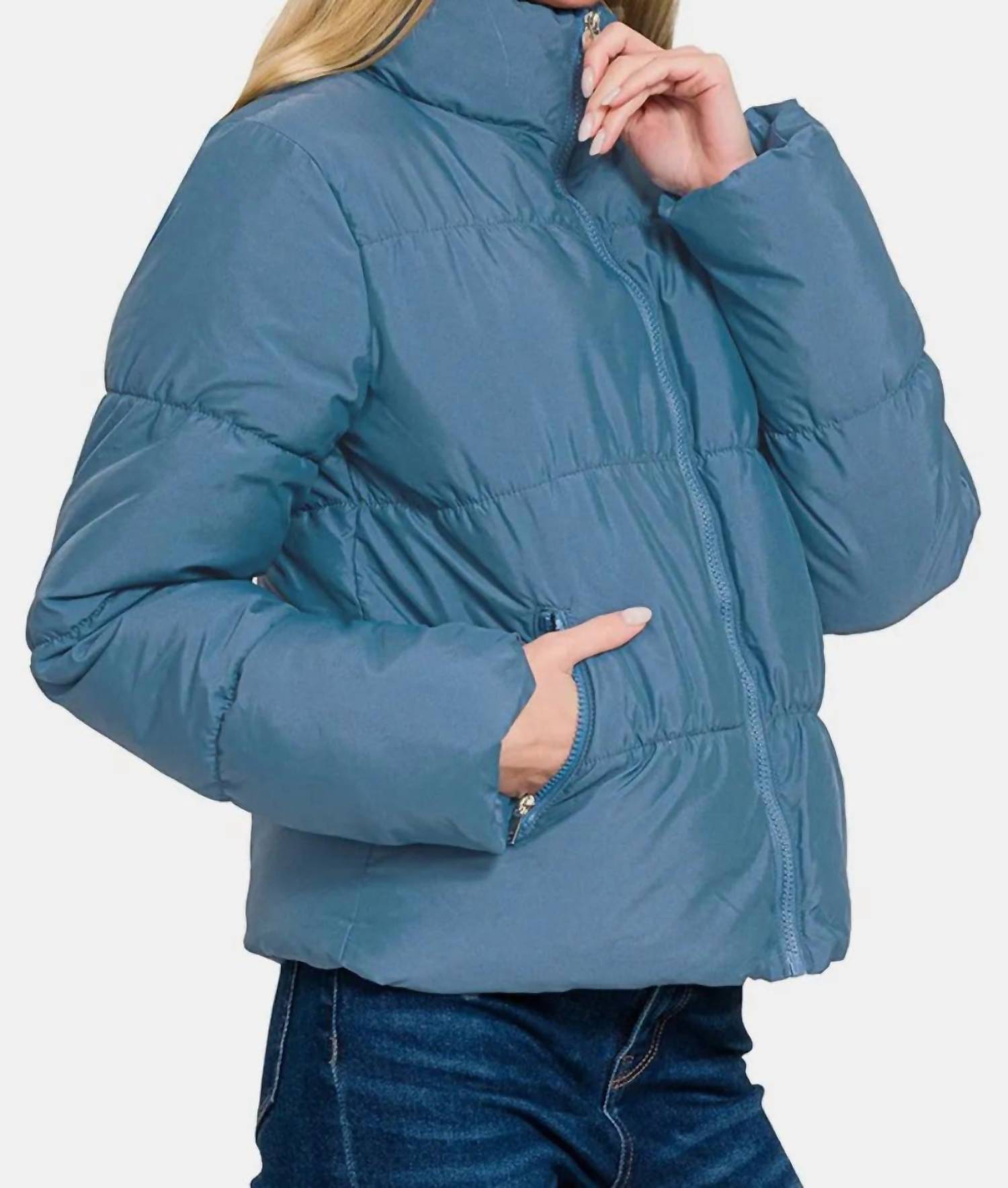 Cozy, cute and timeless. The puffer jacket that will keep you warm all season long. Stay warm and stylish with the ZENANA Zip Up Turtleneck Puffer Jacket in Dusty Blue, perfect for chilly winter days. This jacket features a high collar and long sleeves, offering exceptional warmth and comfort. Made from a blend of 88% polyester and 12% nylon, it boasts a convenient zip closure and pocketed design for added functionality. Care is effortless with machine wash cold and tumble dry low instructions, and it comes in sizes ranging from small to extra-large, accommodating bust sizes of 34 to 42 inches. This imported puffer jacket is a versatile addition to your winter wardrobe.