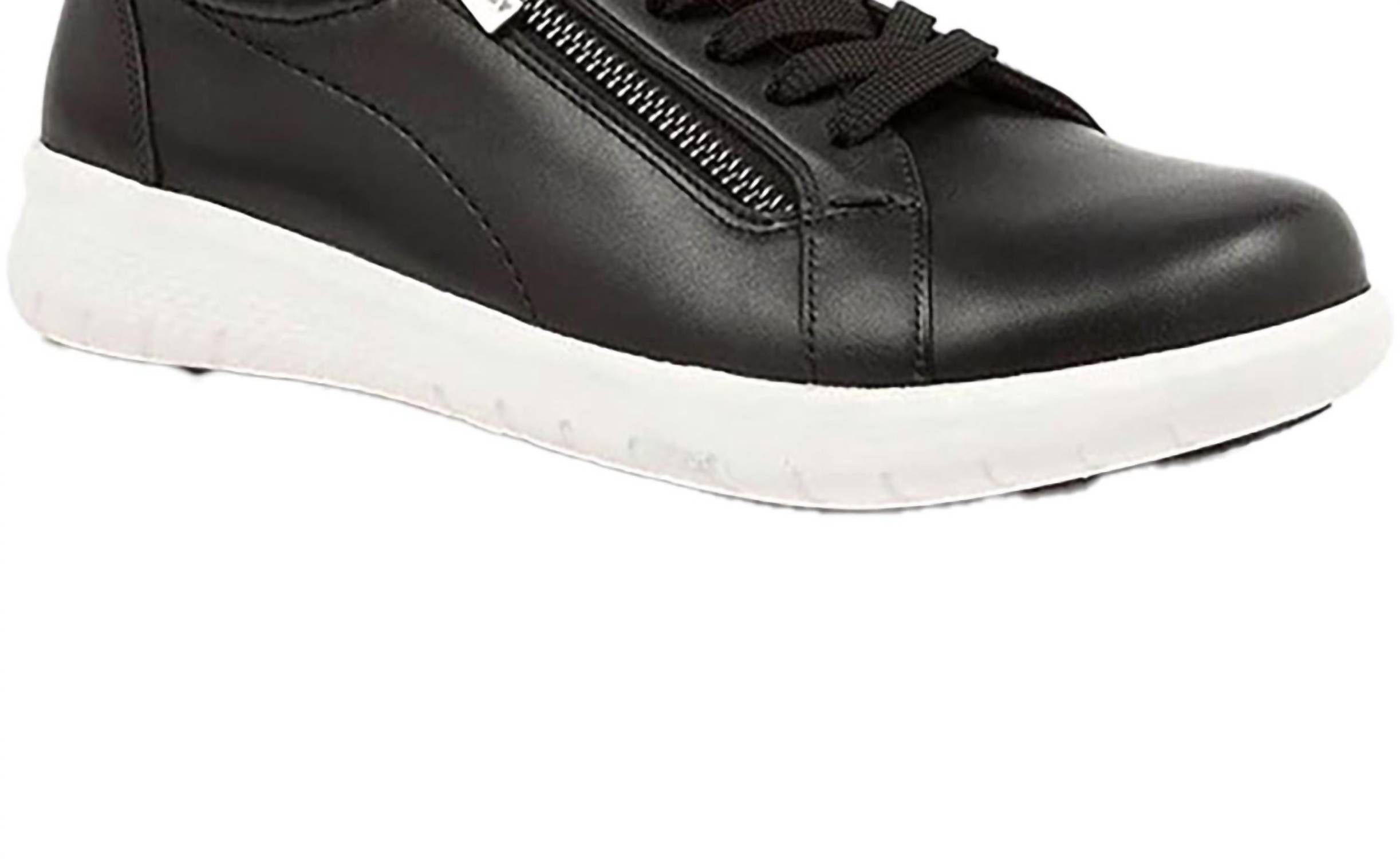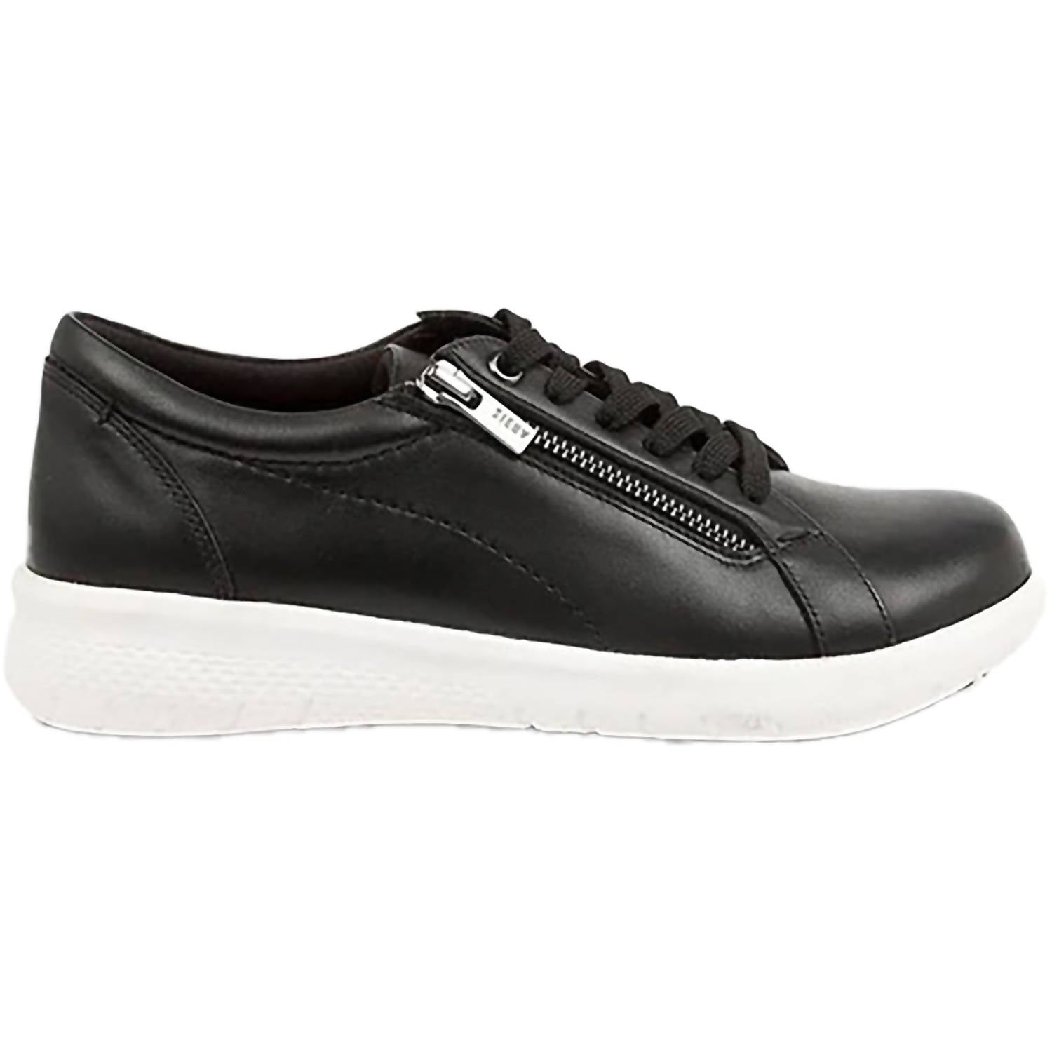 Cute, functional, and comfortable. These sneakers check all the boxes. Step up your casual style with the Ziera Women's Solar Sneaker, featuring a chic black leather design contrasted with a white sole. Crafted from premium leather, these sneakers offer a super support footbed and are orthotic friendly, making them perfect for all-day comfort. Closure: Convenient lace-up and side zipper fastening. Designed with an extra-wide fit and adjustable forefoot inserts, these shoes have a slip-resistant sole and a comfortable low heel height of 1.25 inches.