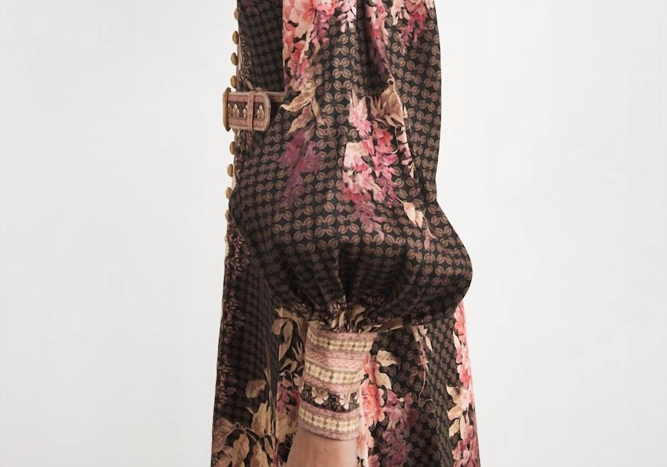 A midi dress so versatile, your options for wearing it are endless. Introducing the Zimmermann Belted Button Midi Dress in a striking black floral pattern, perfect for an evening event. This A-line dress features long sleeves and is crafted from 100% linen for lightweight comfort. With a chic crewneck and a button closure, it embodies a refined maximalist trend. Care for this sophisticated garment is easy with dry clean instructions.