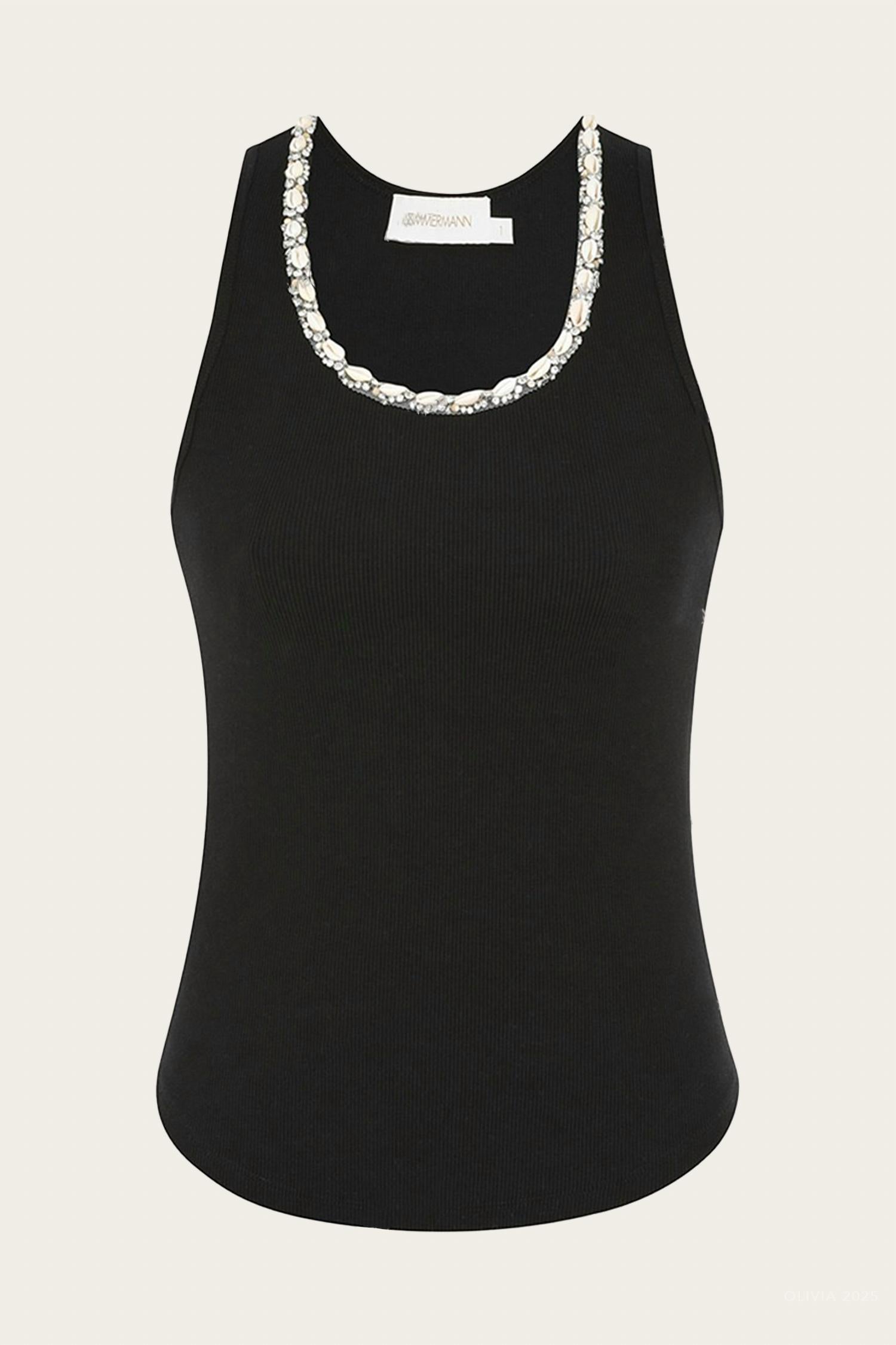 Meet the Zimmermann Illuminate Embellished Tank, an exquisite piece crafted for the fashion-forward woman. With its sleeveless design and scoop neck, this tank is made from a blend of 95% cotton and 5% elastane, offering both comfort and style. The black hue is adorned with eye-catching crystal embellishments and features a straight hem for a sleek silhouette. Made in France, this pull-on tank top requires a dry clean to maintain its pristine condition.